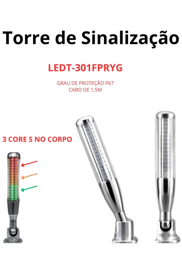 Trabalhamos com torres de 1 a 5 módulos, com opções em luz fixa, piscante e intermitente, podendo ser combinadas em diferentes cores: vermelho, amarelo, verde, azul e branco, conforme a necessidade do seu processo.